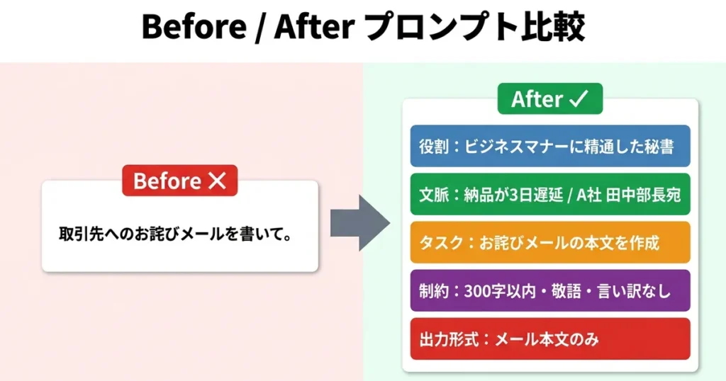 違いは明確です。5つの要素を埋めるだけで、プロンプトの精度は劇的に上がります。