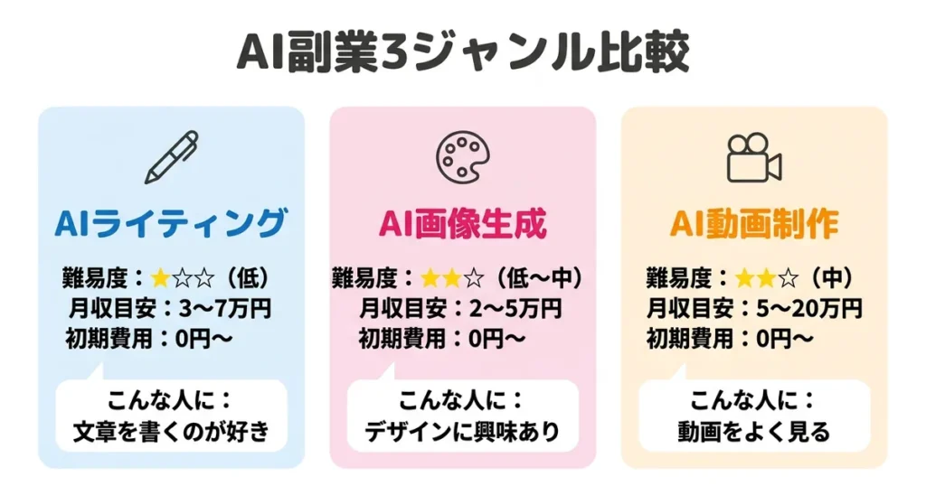 迷ったら、まずはAIライティングから始めてみてください。初期費用ゼロで、今日すぐに始められます。ライティングで身につけたAIの使い方は、他のジャンルにも応用できます。