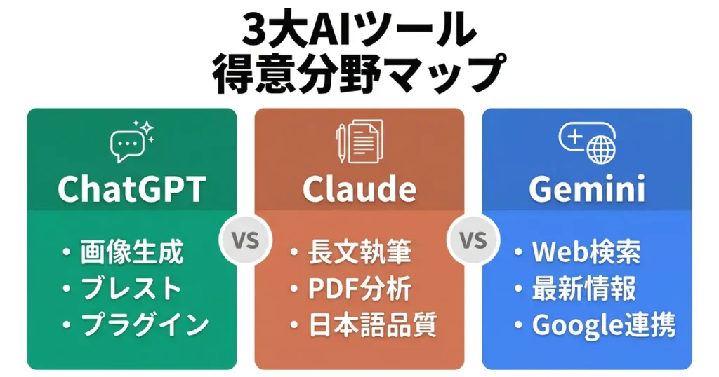 2026年現在、ChatGPT・Claude・Geminiの3大AIは、それぞれ明確に得意分野が違います。料理で言えば、包丁・フライパン・鍋のどれが最強かを議論するようなもの。答えは「作る料理による」です。