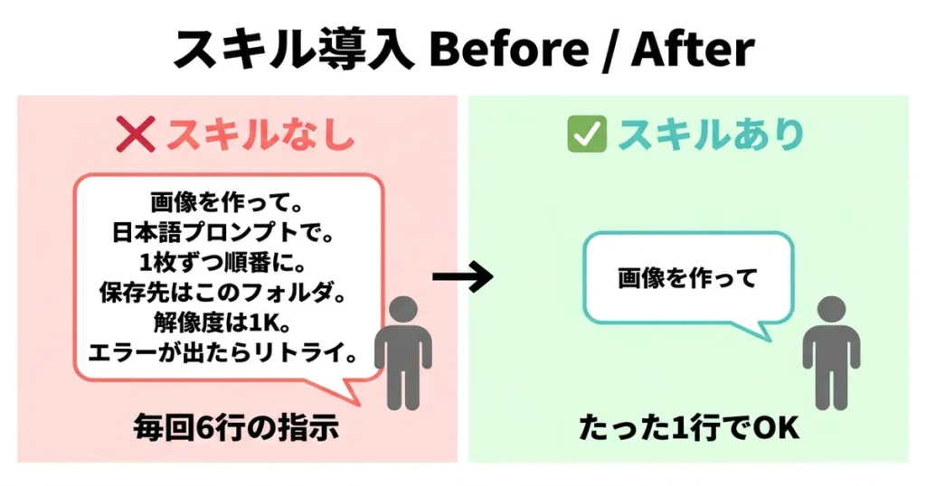 あなた:「画像を作って」指示が1行で済むだけでなく、品質も安定します。毎回同じルールで作業してくれるので、「あれ、今回は英語プロンプトで生成しちゃった」「保存先が違うフォルダになってる」といったミスがなくなります。